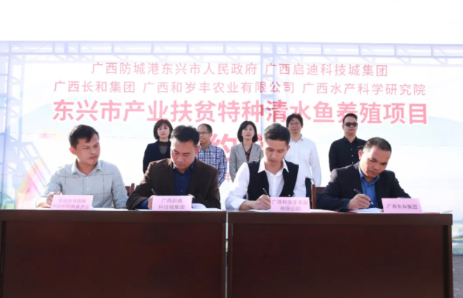 廣西啟迪聯(lián)合農(nóng)產(chǎn)企業(yè)共同打造“產(chǎn)業(yè)+技術(shù)+資本”的扶貧新模式,堅持優(yōu)勢互補、共擔(dān)風(fēng)險、合作共贏。該模式將養(yǎng)殖特種清水魚,通過技術(shù)支持,減輕養(yǎng)殖成本壓力,降低養(yǎng)殖風(fēng)險;為農(nóng)戶提供指導(dǎo)、培訓(xùn)等養(yǎng)殖端全鏈條服務(wù)。同時,東興市馬路鎮(zhèn)吊應(yīng)村村委和廣西和歲豐農(nóng)業(yè)有限公司簽署《包銷回購協(xié)議》,共同助力吊應(yīng)村開拓農(nóng)產(chǎn)品銷路、搭建線上線下銷售平臺、打造特色品牌,實現(xiàn)以點帶面助推馬路鎮(zhèn)、東興市的脫貧和發(fā)展致富。