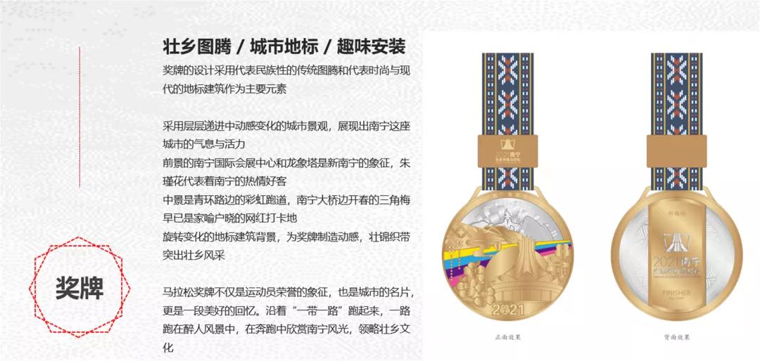 完賽獎牌方面,精雕細(xì)琢,榮耀禮贊。獎牌由廣西工藝美術(shù)研究院匠心雕琢,正面以南寧市的地標(biāo)性建筑南寧國際會展中心為視覺中心,南寧市市花“朱槿花”為背景,輔之以流動的線條,將南寧的人文氣質(zhì)、地標(biāo)建筑、城市特點三個維度無縫融合,展現(xiàn)了首府南寧的城市風(fēng)情和崛起氣勢。獎牌使用圓形,簡潔圓融象征圓滿成功,鏤空鑲嵌轉(zhuǎn)動設(shè)計再添動感活力,每一次轉(zhuǎn)動都是與壯鄉(xiāng)首府的對話。