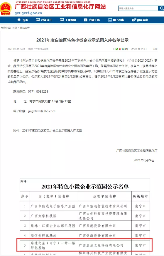 根據(jù)《自治區(qū)工業(yè)和信息化廳關(guān)于開展2021年百家特色小微企業(yè)示范園申報的通知》(企業(yè)辦20210027)要求,廣西壯族自治區(qū)工業(yè)和信息化廳組織開展了2021年度自治區(qū)特色小微企業(yè)示范園的申報工作,按照示范園認定條件,經(jīng)過嚴格審核,于8月24日發(fā)布了《2021年度自治區(qū)特色小微企業(yè)示范園入庫名單公示》,啟迪之星(南寧)一帶一路孵化基地位列其中,可喜可賀!