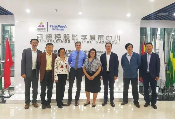 隨后,Lynn Videka院長一行參觀考察了啟迪控股數字展廳,細致了解了啟迪控股的發(fā)展歷程、“科技園區(qū)、科技實業(yè)、科技金融”三位一體業(yè)務布局以及“多重立體三螺旋”的商業(yè)模式,并對啟迪控股能夠積極參與環(huán)保、新能源和大健康等與民眾生活息息相關領域的科技投資和技術孵化、積極從事社會公益事業(yè)、服務社會發(fā)展的企業(yè)價值觀表示高度贊賞。