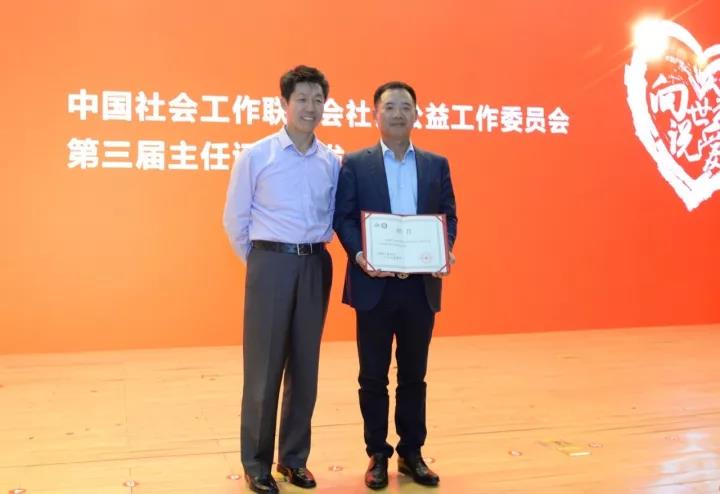 ▲ 中國社會工作聯合會黨委副書記、副會長何建民(左)為新任中國公益委員會主任王濟武頒發(fā)證書