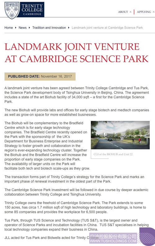 劍橋大學(xué)三一學(xué)院官方發(fā)布:https://www.trin.cam.ac.uk/news/landmark-joint-venture-at-cambridge-science-park/(點擊圖片閱讀)