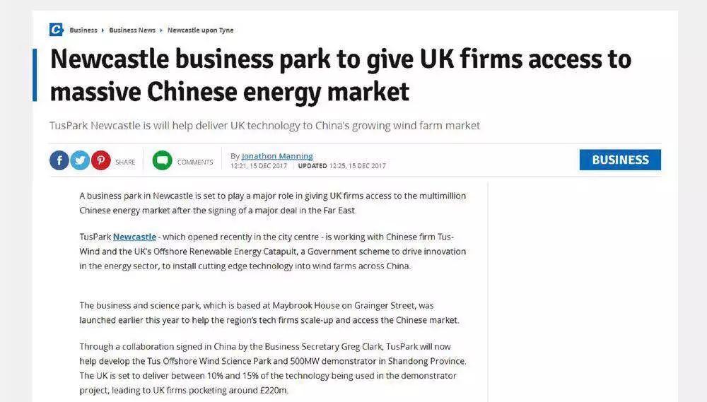 12月15日,英國(guó)媒體Chroniclelive報(bào)道近期開(kāi)業(yè)的啟迪紐卡斯?fàn)柨萍紙@將幫助英國(guó)的先進(jìn)技術(shù)進(jìn)入中國(guó)不斷增長(zhǎng)的風(fēng)力發(fā)電市場(chǎng)。