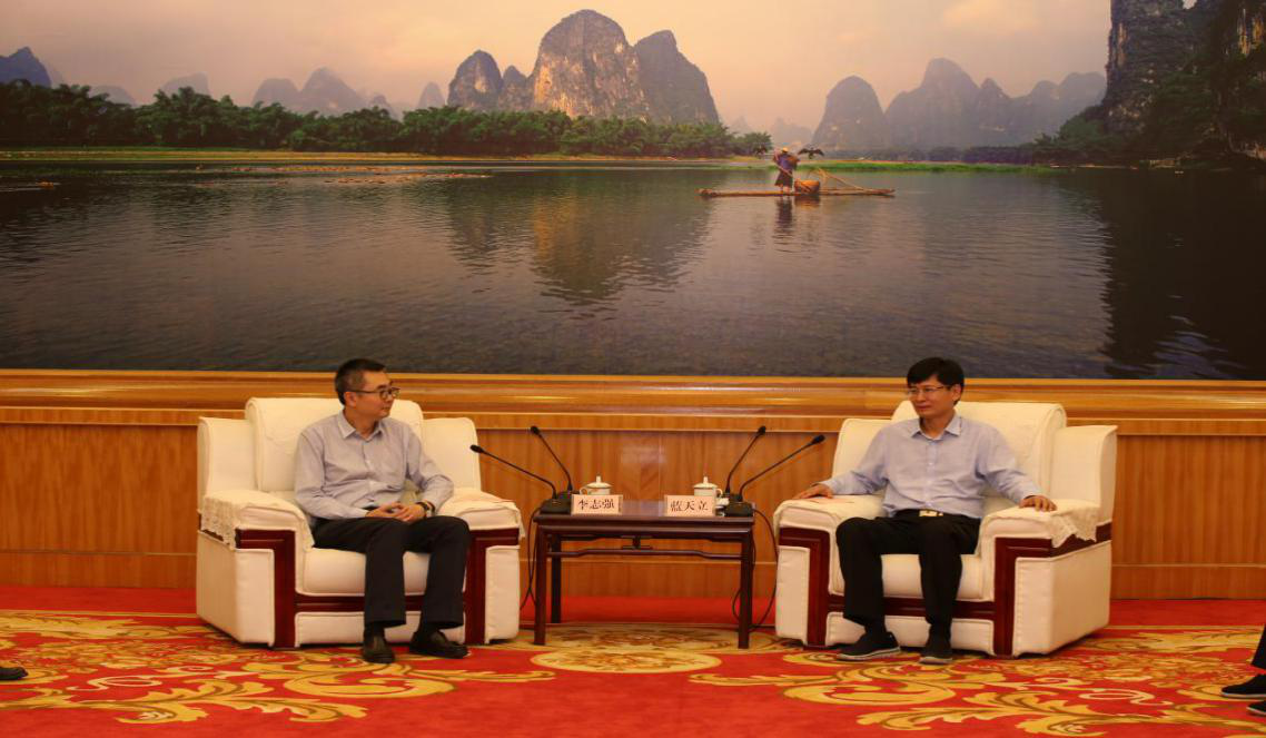 (圖為廣西自治區(qū)政府常務(wù)副主席藍(lán)天立會(huì)見啟迪控股黨委書記兼副董事長、清華科技園管委會(huì)主任李志強(qiáng))