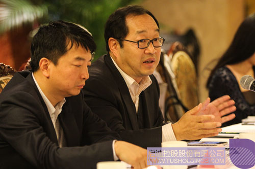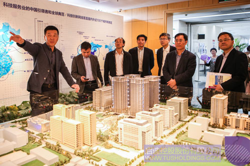孫旭東高級(jí)副總裁(左一)向代表團(tuán)介紹啟迪控股