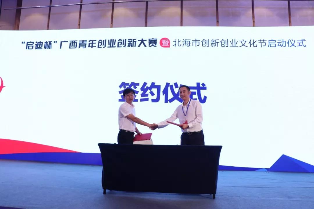 啟動儀式上,共青團(tuán)廣西區(qū)委和廣西啟迪就在青年創(chuàng)新創(chuàng)業(yè)、人才培養(yǎng)、志愿服務(wù)、對外交流等方面開展合作簽訂《戰(zhàn)略合作協(xié)議》,共青團(tuán)廣西區(qū)委副書記鄭勝景與廣西啟迪常務(wù)副總裁樓潤智代表雙方簽約。