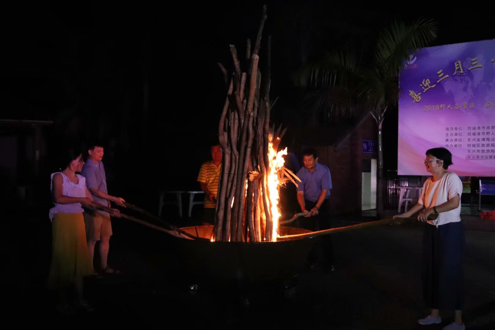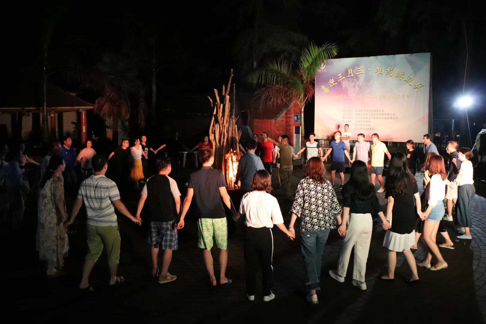 公司幾位領導手持火把點燃木材,熊熊大火沖天而上。圍著篝火,幾十人手牽手、肩并肩玩起游戲,跳起舞蹈。在大火的炙熱中,每個人汗如雨下,歌聲、笑聲、歡樂聲不絕于耳。