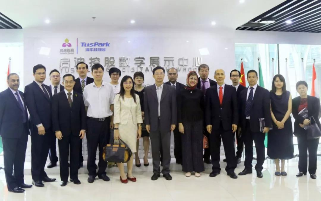 ▲ 啟迪控股常務副總裁陳鴻波(前排左六)陪同馬來西亞代表團參觀交流