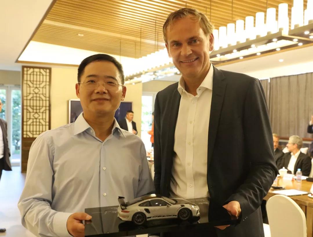 座談會(huì)后,Oliver Blume博士向王濟(jì)武董事長(zhǎng)贈(zèng)送保時(shí)捷911汽車模型并合影留念。