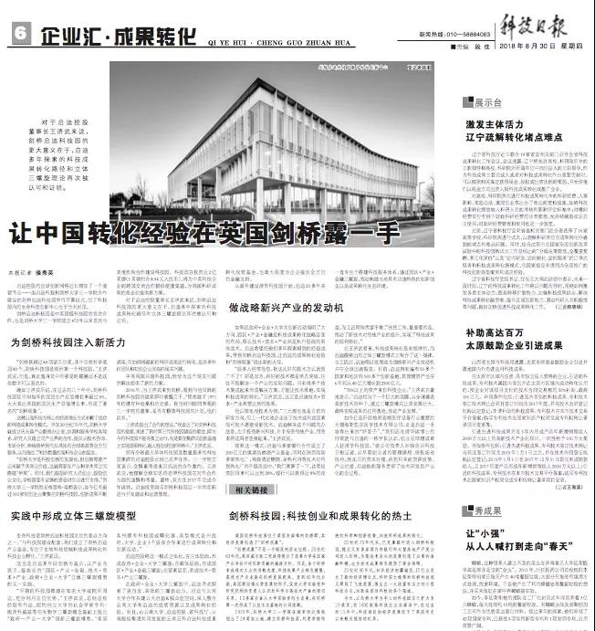 ▲ 2018年8月30日科技日報發(fā)布《讓中國轉(zhuǎn)化經(jīng)驗在英國劍橋露一手》專題報道
