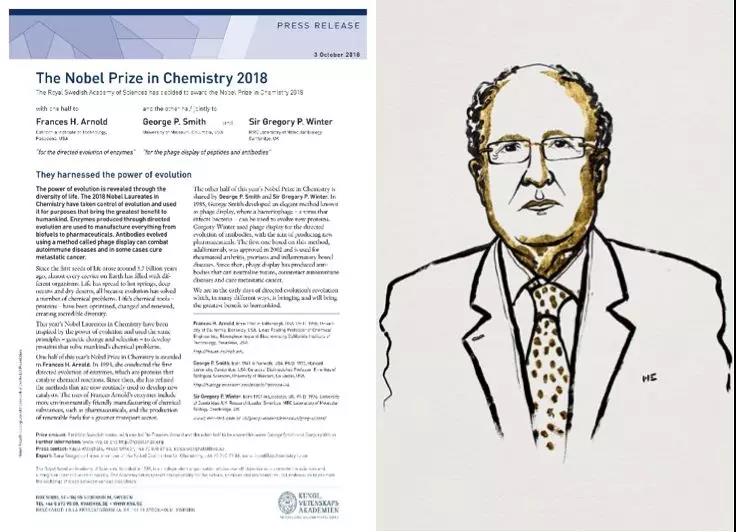 ▲瑞典皇家科學(xué)院官方宣布本年度諾貝爾化學(xué)獎歸屬,右圖為劍橋大學(xué)三一學(xué)院院長Sir Gregory Winter漫畫肖像