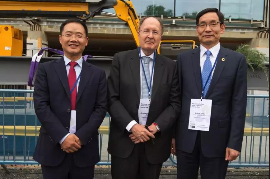 ▲三一學(xué)院院長Sir Gregory Winter(中)、啟迪控股董事長王濟(jì)武(左)與國新國際董事總經(jīng)理周育先(右)共同見證生命科技創(chuàng)新中心封頂儀式