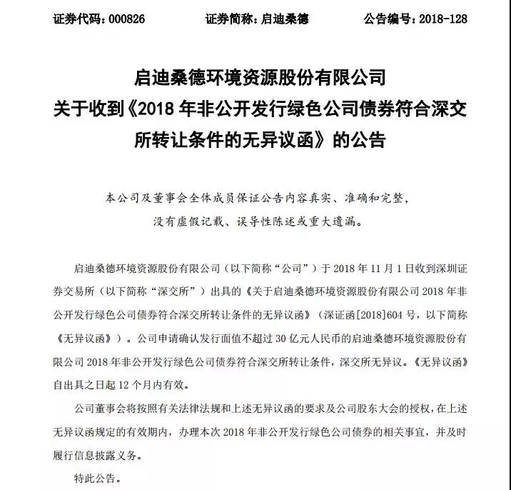 啟迪桑德收到2018年非公開發(fā)行綠色公司債券無異議函