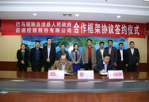 啟迪控股常務(wù)副總裁、啟迪科技城集團董事長陳響(前排左)與廣西巴馬縣長藍海洲(前排右)簽署大健康產(chǎn)業(yè)合作框架協(xié)議