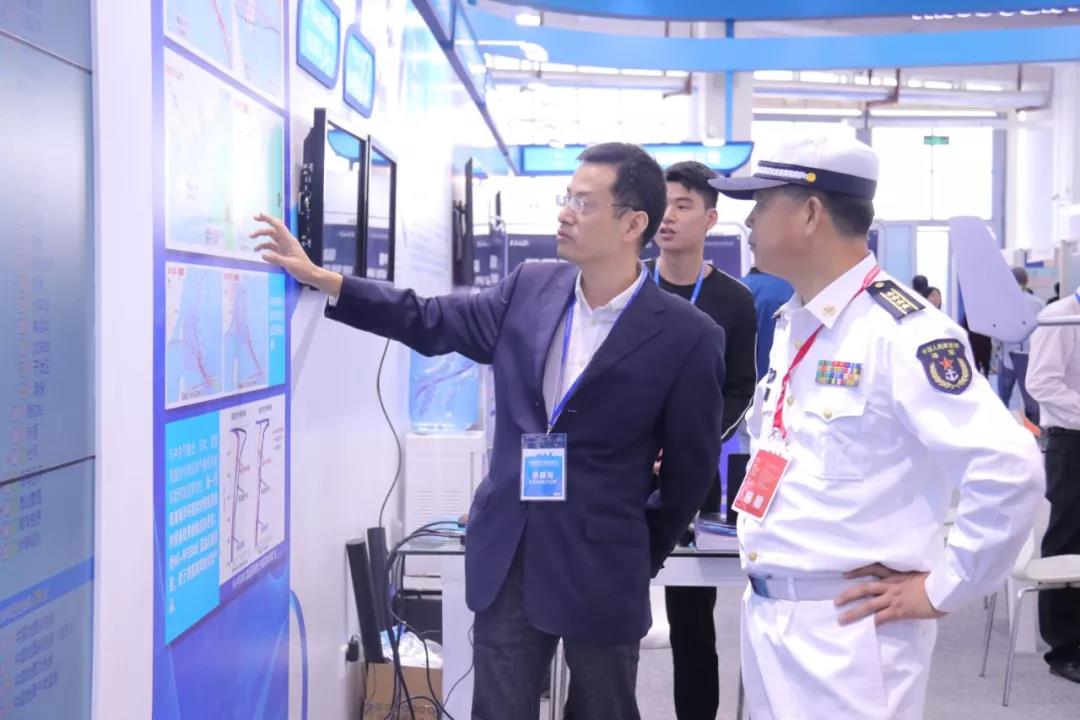 ▲ 某艦隊領(lǐng)導(dǎo)饒有興趣地參觀湛江啟迪展區(qū),詳細(xì)了解集成了風(fēng)暴潮、海浪等預(yù)警成果、實時雷達(dá)數(shù)據(jù)與海域無人機(jī)及海上無線通信技術(shù)的“啟迪海洋+”科創(chuàng)平臺