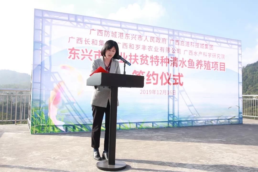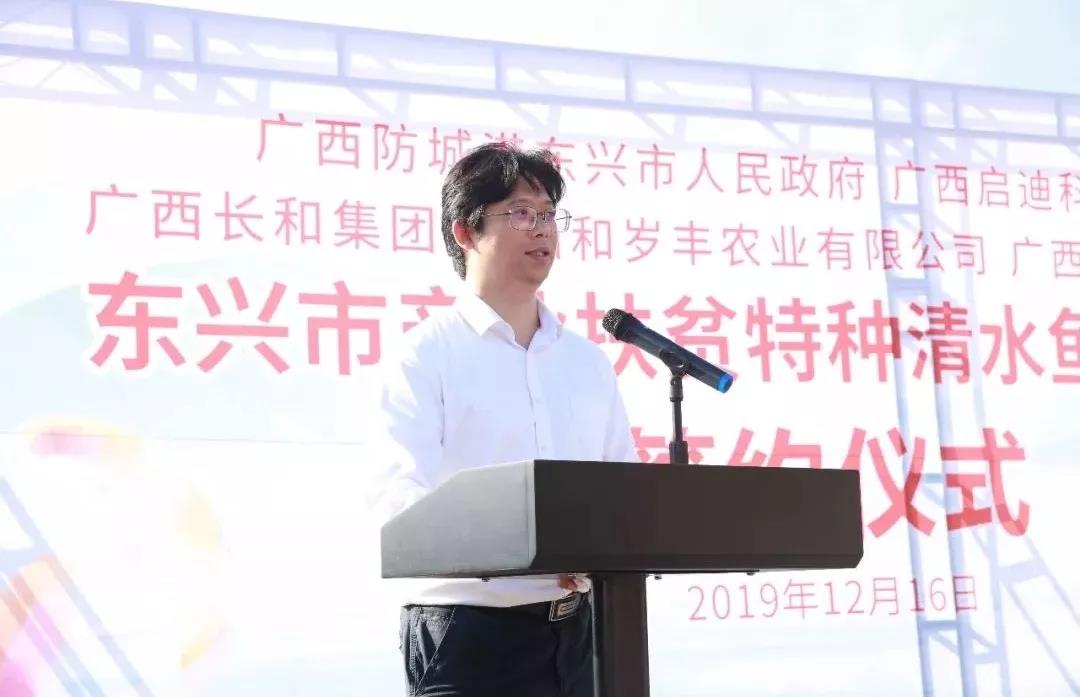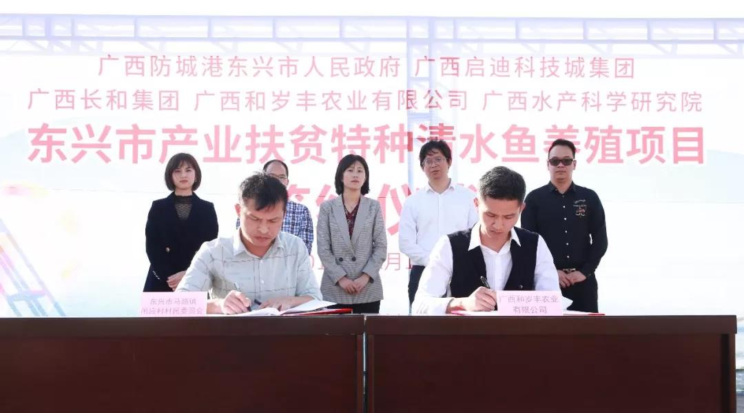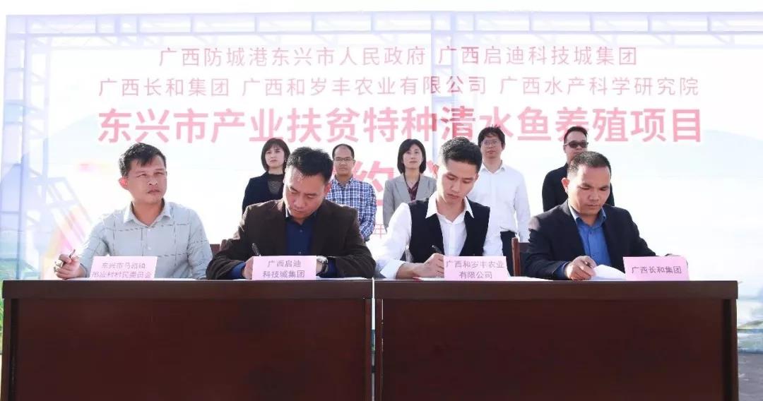 為發(fā)展好廣西東興市“3+1”特色產(chǎn)業(yè)體系,提升貧困群眾的內(nèi)生動力,全力打贏脫貧攻堅戰(zhàn),加快助力東興市產(chǎn)業(yè)扶貧特種清水魚項目養(yǎng)殖發(fā)展,減輕農(nóng)戶養(yǎng)殖成本,降低魚類養(yǎng)殖風(fēng)險,助力貧困戶脫貧致富,開拓農(nóng)產(chǎn)品銷路、打造特色農(nóng)業(yè)品牌。12月16日,廣西防城港東興市人民政府、廣西啟迪科技城集團(tuán)、廣西長和集團(tuán)、廣西和歲豐農(nóng)業(yè)有限公司和廣西水產(chǎn)科學(xué)研究院共同舉行了東興市產(chǎn)業(yè)扶貧特種清水魚養(yǎng)殖項目簽約儀式。