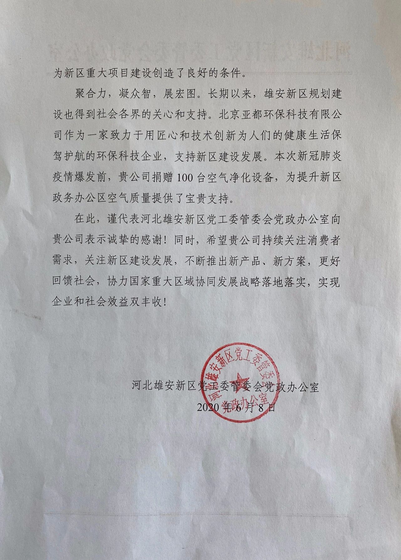 6月16日,河北雄安新區(qū)黨工委管委會(huì)黨政辦公室向啟迪亞都發(fā)來(lái)一封感謝信,由衷感謝啟迪亞都對(duì)新區(qū)建設(shè)發(fā)展的支持和對(duì)抗擊新冠肺炎疫情的傾力相助和愛(ài)心奉獻(xiàn)。信中指出:“北京亞都環(huán)保科技有限公司作為一家致力于用匠心和技術(shù)創(chuàng)新為人們的健康生活保駕護(hù)航的環(huán)??萍计髽I(yè),支持新區(qū)建設(shè)發(fā)展。”